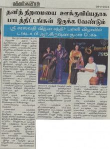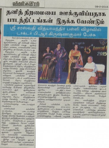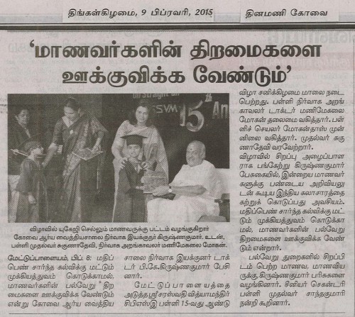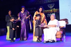 The 15th Annual Day celebration was held on 7th February 2015. Padmashri. Dr. P. R. Krishna Kumar, the Managing Director, Arya Vaidhya Pharmacy Ltd., Coimbatore was the Chief Guest . Mrs. A. Suguna Devi, the Principal welcomed the gathering . Dr. Manimekalai Mohan, the Managing Trustee and correspondent, Mr. Mohan Doss, The Trustee and secretary felicitated the Chief Guest. The Annual Report for the year 2014-2015 was presented. The guest of honour conferred Graduations on 56 UKG children and gave away proficiency certificates and prizes to winners. Teachers were also honoured. He also released a book “MY GALLOPING THOUGHTS” authored by our staff Mrs. Bhavani and the Managing Trustee received the first copy.